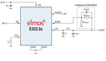 E522.10是一种低成本、易于使用的降压变换器,适用于汽车(QFN20L4)或工业/消费环境(QFN20L4和SOIC8EP),结温升高至+160°C。典型的结温为+185°C提供过温保护,它提供基于内部800 mV基准的电阻可编程输出电压,并通过提供内部200 mV基准提供电流调节拓扑(例如LED驱动器)。低电流消耗的类型。睡眠模式仅提供10μA。集成轻载检测可以自动将电流消耗切换到只有15μA的有源输出调节.多功能高压电源好信号提供欠压或过电压信息.采用快速自适应频率运算(脉冲频率调制方案)从0 HZ到Typ。500 kHz允许最佳的线路和负载瞬态响应,而不需要外部补偿网络。调节是空载稳定的,允许100%的占空比而不带自举电容.集成折叠式过流保护在启动和输出短路时限制输入电流。
